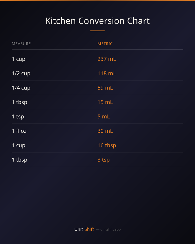 Cups, tablespoons, teaspoons, and mL conversions for cooking and baking.